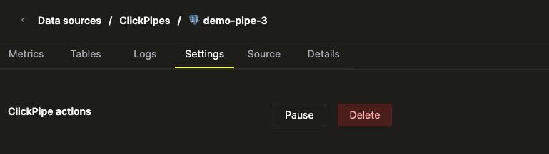 - На вкладке Data Sources выберите MySQL ClickPipe, который нужно приостановить.